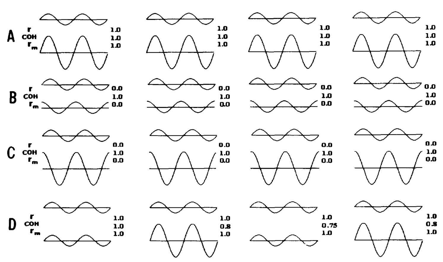 Now we’ve got a bunch of sinewaves with the parameters chosen above. Next, we will calculate the coherence and the correlation between all pairs of signals. This way we can see how these values change for different kinds of input signals.