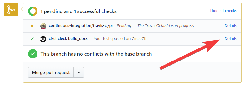 Once the documentation is built (or if it fails) you can click on the CircleCI link from the GitHub UI in order to see what happened.