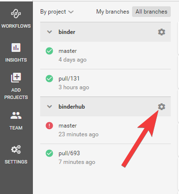 Because we’re doing this in order to preview changes to the documentation in a Pull Request, we now need to tell CircleCI to run builds on PRs to your repo. To do so, go to the CircleCI UI, click on “Jobs”, then click your project name, then click the settings button here: