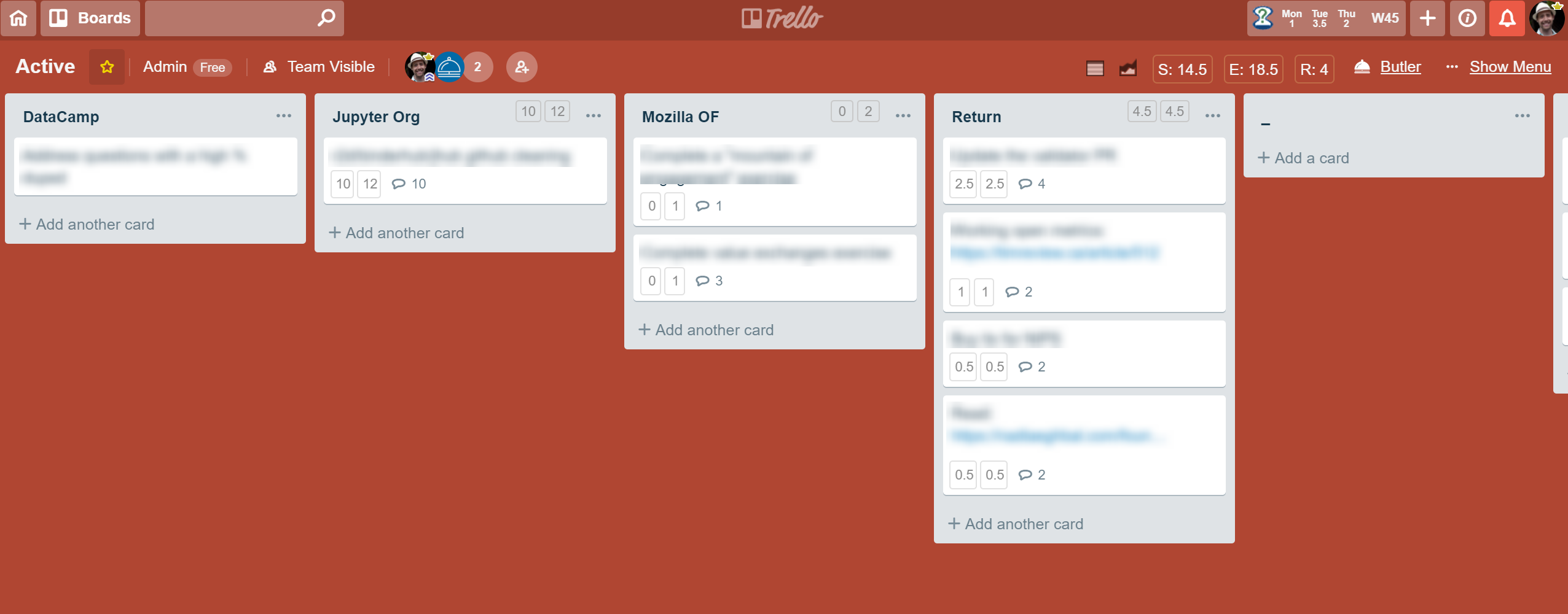 An additional component is that each card is assigned a number of hours needed to complete the card. I try to keep the total number of hours on this board to <= 20. I’ve found that this is a realistic balance between “enough hours to actually get stuff done” and “not so many hours that I won’t finish them”.