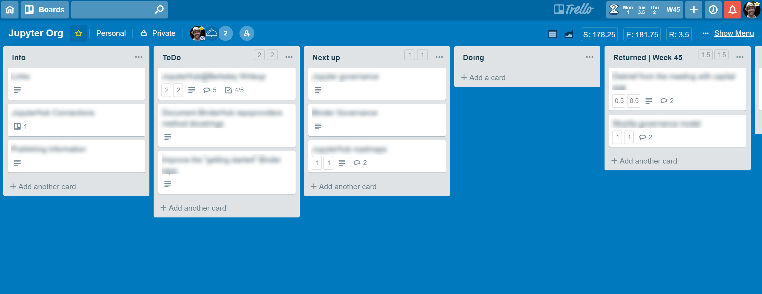I use two kinds of Trello boards, “project” boards, and my “weekly” board.